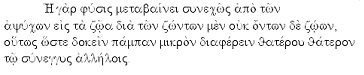 - Η φύση μεταβαίνει συνεχώς από τα άψυχα στα ζώα, διαμέσου των ζώντων που δεν είναι ζώα (Στμ.: π.χ. τα φύλλα των φυτών, οι μικροοργανισμοί), με αποτέλεσμα τα συγγενή μεταξύ τους (Στμ: έμβια όντα) να φαίνεται ότι διαφέρουν ελάχιστα (Α-Ι, π. Ζ. Μορ. 681, α31).